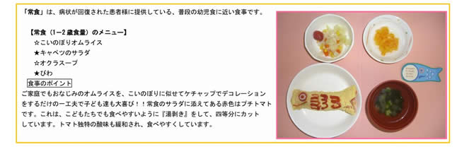食事内容は症状にあわせて随時変更しており、常食・軟飯食・7分粥食・つぶし食・離乳食・特別治療食となっています。
