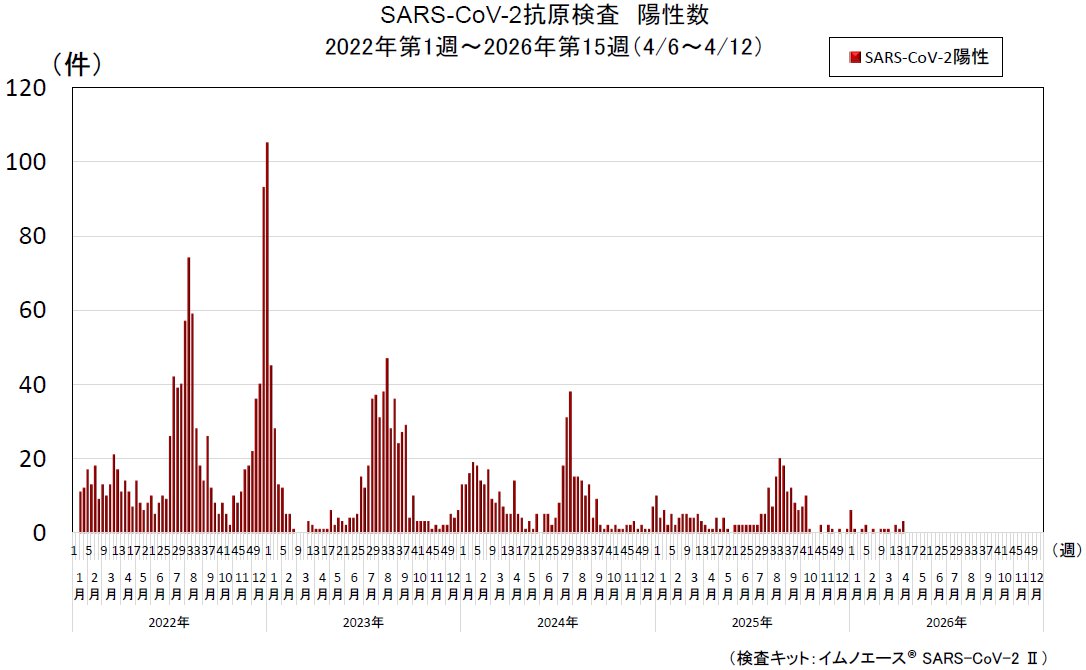 新型コロナウイルス(SARS-CoV-2)抗原検査は62検体を検査し、3件(4.8%)の陽性でした。