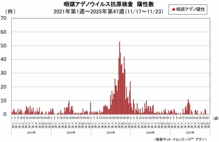 咽頭アデノウイルスは37検体を検査し、3件(8.1%)の陽性でした。
