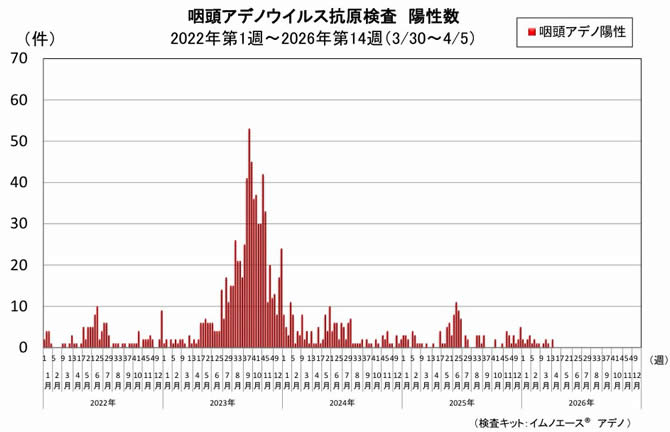 咽頭アデノウイルスは42検体を検査し、2件(4.8%)の陽性でした。
