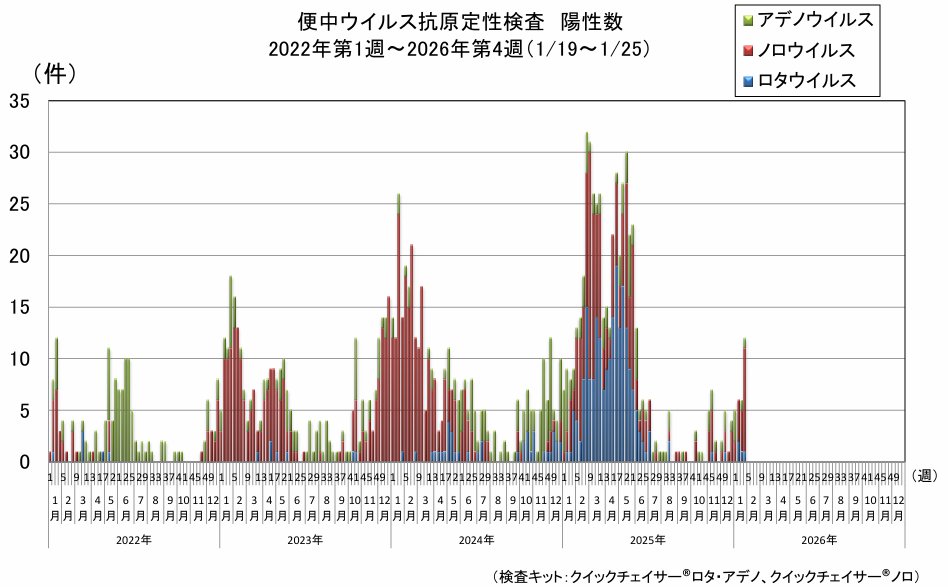 ロタウイルスは50検体を検査し、1件(2.0%)の陽性でした。