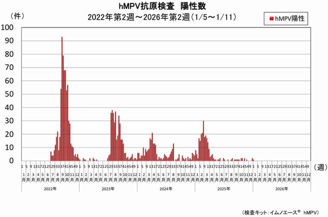 ヒトメタニューモウイルスは39検体を検査し、0件(0.0%)の陽性でした。