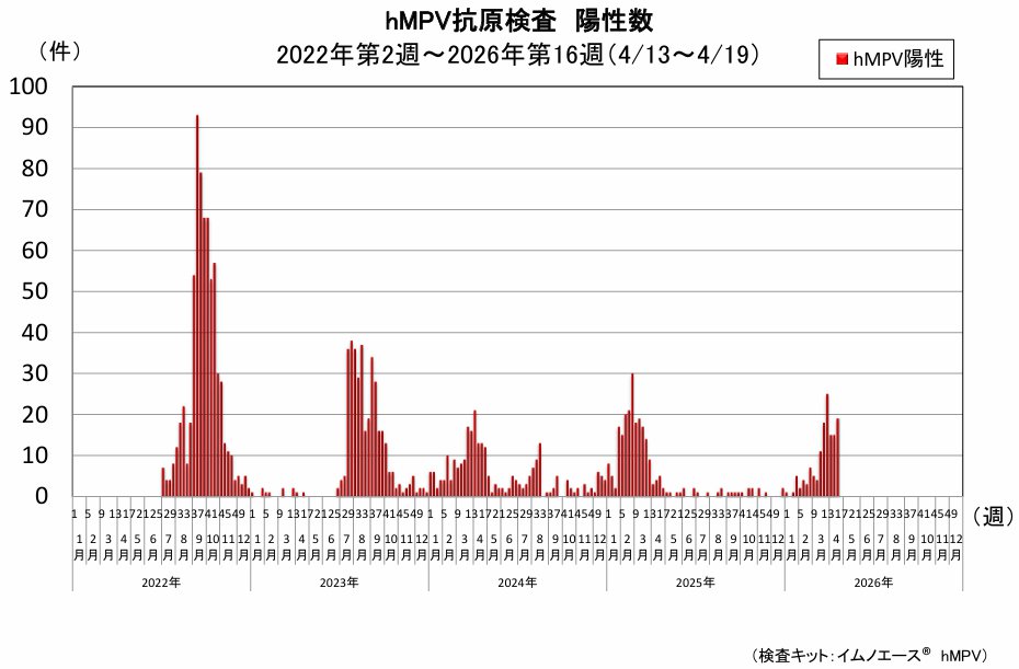 ヒトメタニューモウイルスは120検体を検査し、19件(15.8%)の陽性でした。