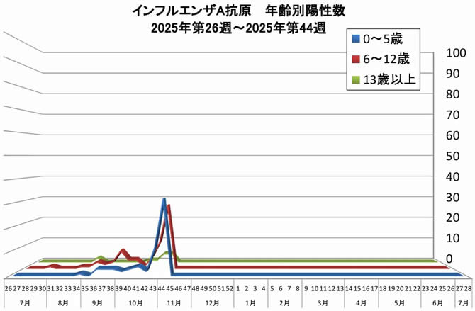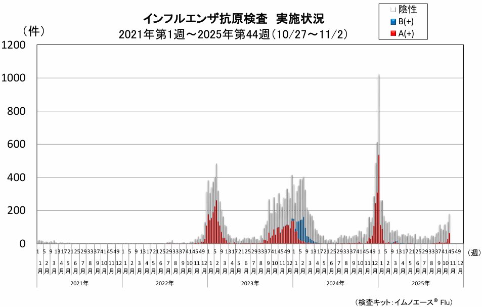 インフルエンザは181検体を検査し、A抗原が64件(35.4%)、B抗原が1件(0.6%)の陽性でした。