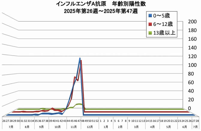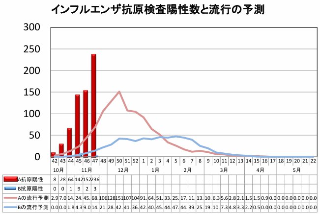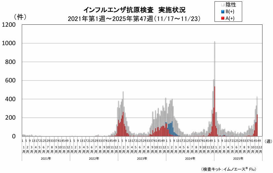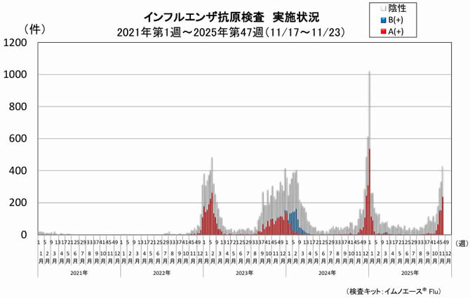 インフルエンザは430検体を検査し、A抗原が235件(54.7%)、B抗原が3件(0.7%)の陽性でした。