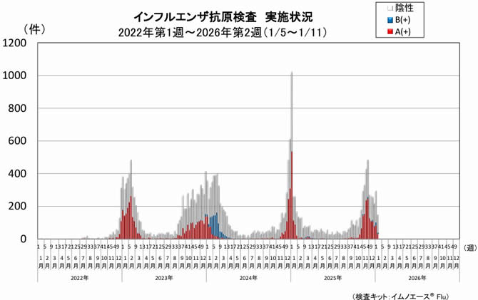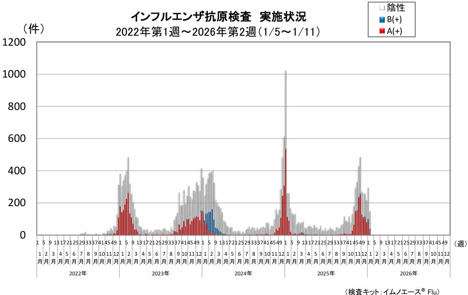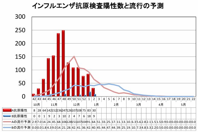 インフルエンザは150検体を検査し、A抗原が30件(20.0%)、B抗原が9件(6.0%)の陽性でした。