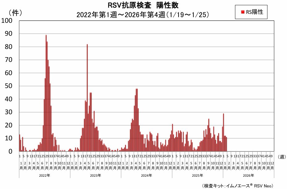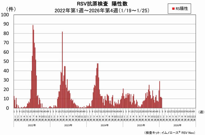 RSウイルスは65検体を検査し、11件(16.9%)の陽性でした。