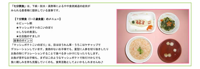 食事内容は症状にあわせて随時変更しており、常食・軟飯食・7分粥食・つぶし食・離乳食・特別治療食となっています。